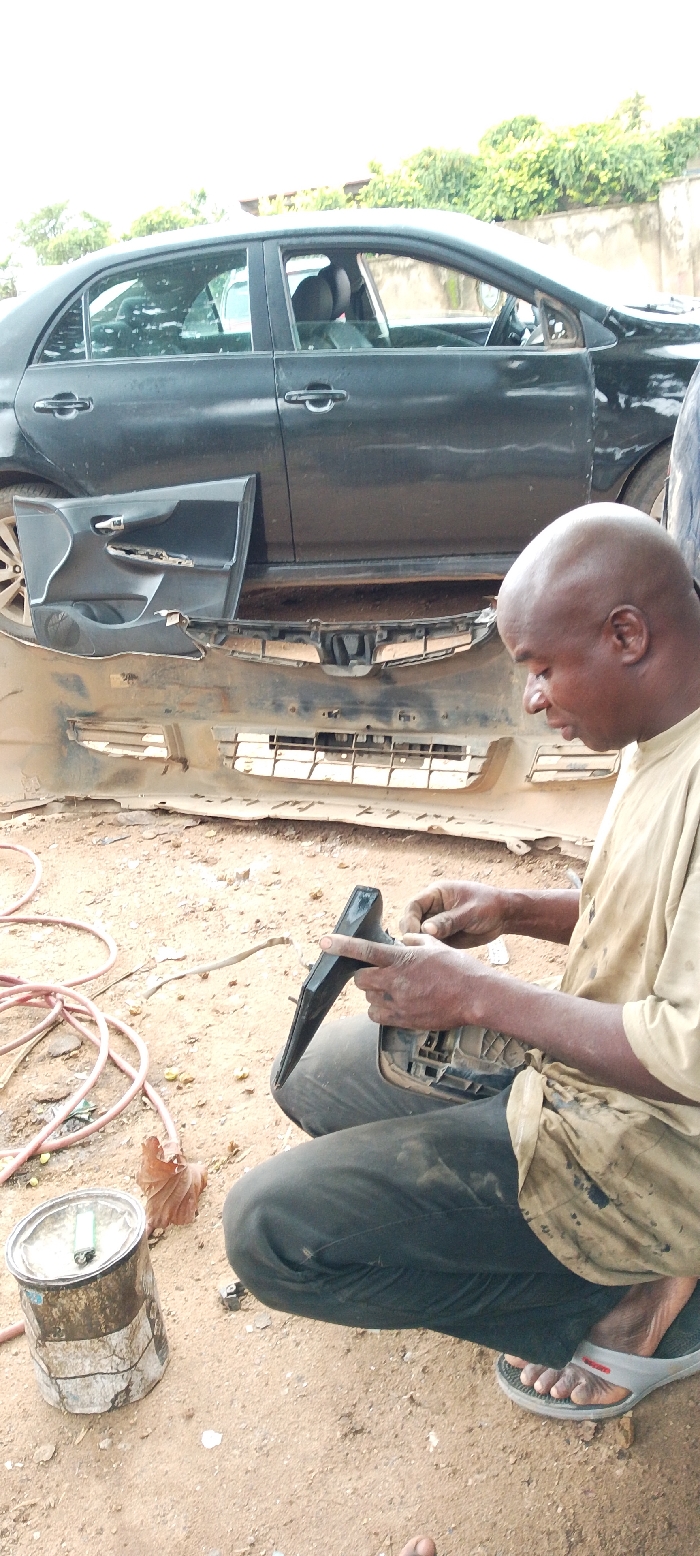The image depicts an outdoor automotive repair scene in Kagini, Nigeria