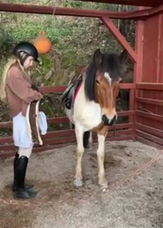young woman preparing a horse for riding. The woman is wearing a riding helmet, a light brown jacket, a light blue skirt, and tall black riding boots. She's standing next to the horse and holding a piece of tack, possibly a girth, which she appears to be adjusting. The horse is a pinto with a predominantly white body, a brown head and mane, and a white blaze on its forehead. It is saddled and standing on sandy ground inside a partially enclosed wooden structure, possibly a stall or shelter. The structure is painted red, and there's a chain attached to the front, seemingly used to restrain the horse. The background shows trees and a hill, suggesting the location is near a wooded area.