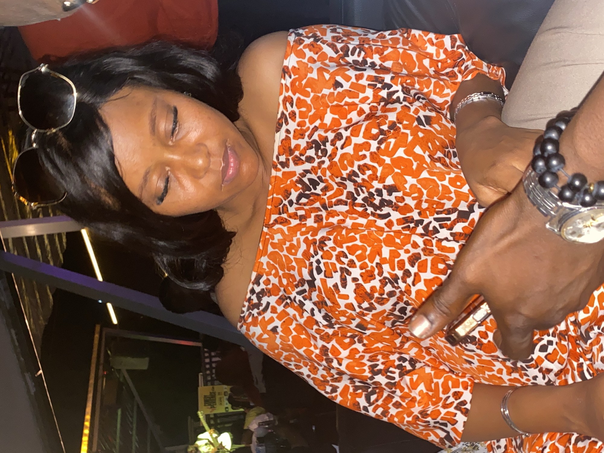 The image captures a woman with dark hair wearing a patterned orange and white dress, reclining on a dark leather-like surface. A pair of sunglasses rests on her head. A person's arm, adorned with multiple bracelets and a watch, is partially visible in the foreground, with a finger pointing downwards. The background suggests an indoor setting, possibly a bar or lounge in Kubwa, Nigeria, with glimpses of lighting fixtures and other patrons in the lower section of the image.