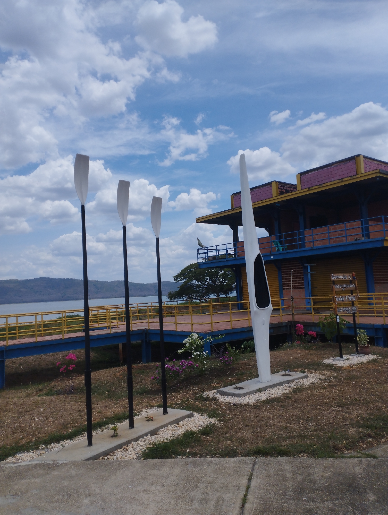 lakeside scene in El Pao, Venezuela. The foreground is dominated by a concrete walkway leading to an area featuring four large, stylized oars. Three are black with white blades and are arranged vertically, mounted on a rectangular concrete base. A larger, white oar, with a black cutout section, stands to the right. Behind the oars, a blue and yellow walkway connects to a two-story building with a pink roof and blue railings. A tree is visible behind the walkway. The walkway leads towards a sign in Spanish. Various flowers are planted around the walkway and sculptures. In the background, a body of water stretches out to the horizon, where distant mountains can be seen. The sky is mostly blue with scattered white clouds.