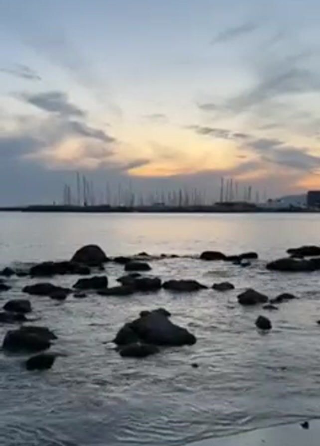 seascape with a sunset sky. The water is calm with small waves lapping against rocks in the foreground. In the distance, there are many sailboat masts visible in a harbor or marina. The sky is a mix of blues, greys, and oranges from the setting sun. There is a small strip of sandy beach in the very foreground.