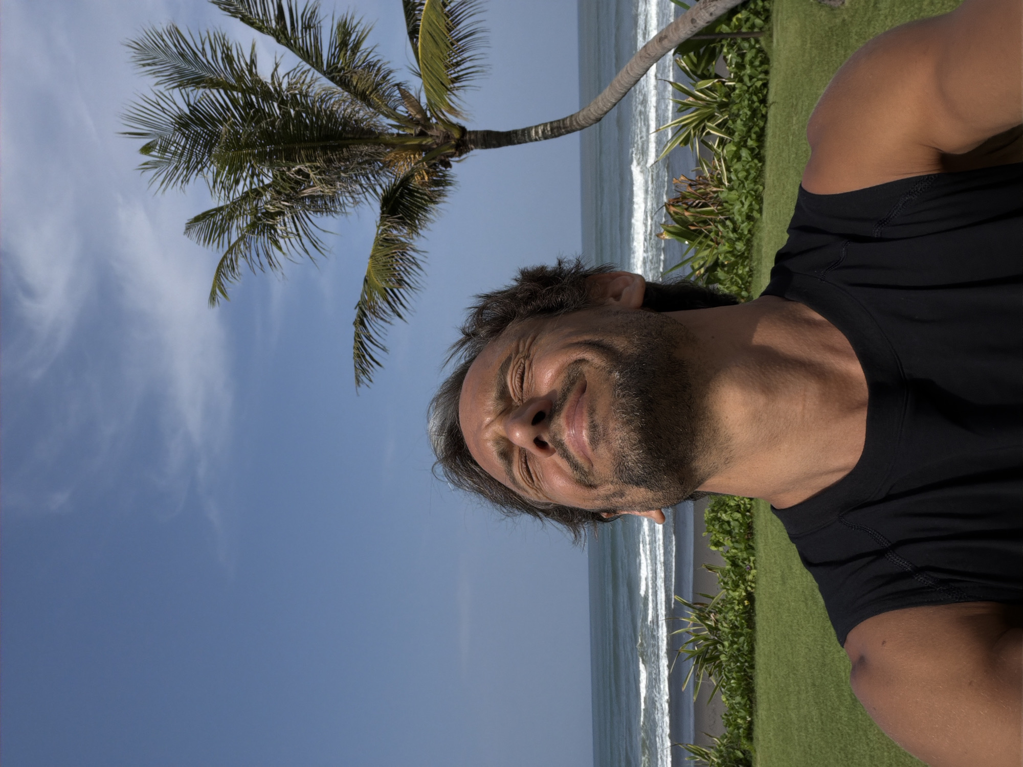 A medium-shot portrait depicts a male individual, appearing tanned, with a beard and dark hair showing some grey, looking upwards with his eyes closed and a wide smile. He is wearing a black sleeveless top. The immediate foreground features a manicured green lawn, followed by a dark sand beach with white ocean waves breaking. Beyond the beach, the blue ocean extends to the horizon under a clear blue sky with minimal, faint white clouds. A tall palm tree with green fronds stands to the right, leaning slightly towards the center. The scene is located in Belalang, Indonesia.