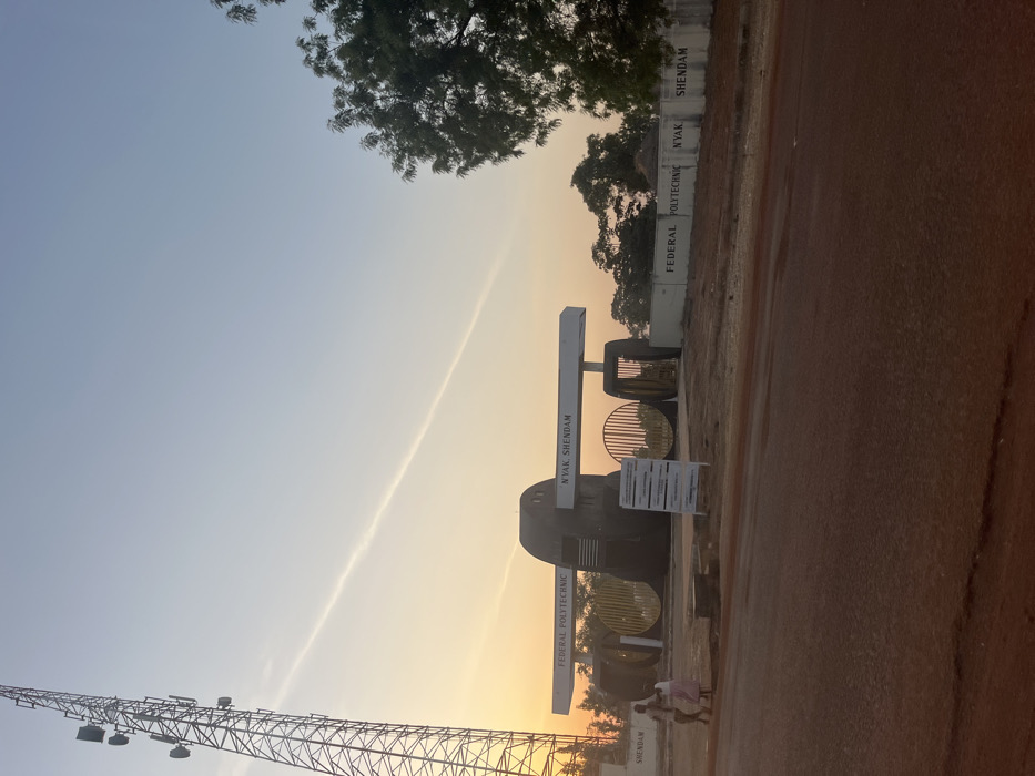 The image displays the entrance to "Federal Polytechnic Nyak Shendam" at dawn or dusk