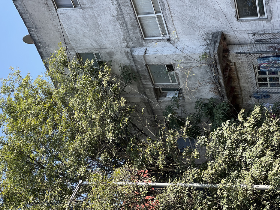 A weathered building is partly obscured by trees and foliage. The structure's facade shows signs of aging, with visible wear and tear. Windows are scattered across the building's exterior, some with window air-conditioning units. Wires run along the building, adding to the cluttered urban scene. The image is shot from a low angle, emphasizing the building's height and the density of the surrounding vegetation.
