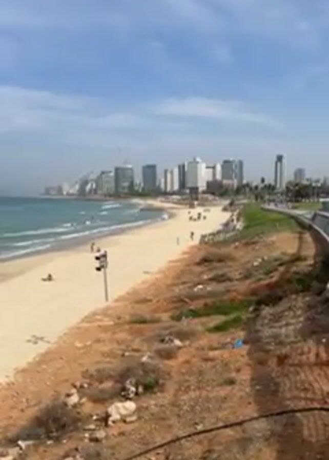 beach in front of a cityscape. The beach is sandy and has waves coming in from the ocean. There are several people on the beach, some of whom are sunbathing or walking. The cityscape is in the background and includes several tall buildings. The sky is blue and there are a few clouds. In the foreground, there is a small, sandy, barren hill with brown bushes and a curved concrete walkway.