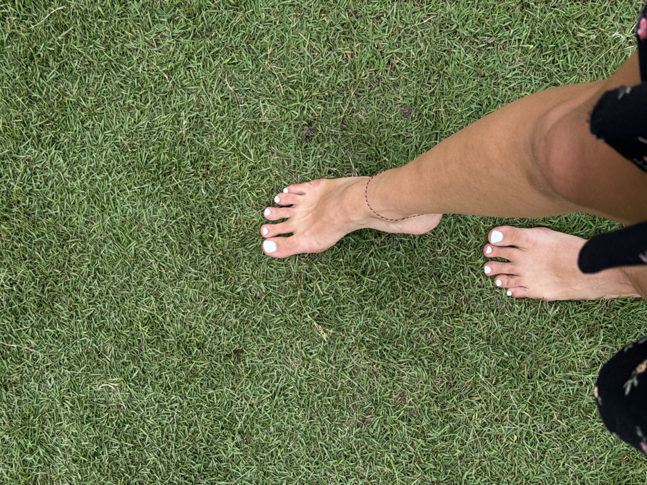 - "An overhead view captures the bare lower legs and feet of an individual positioned on a uniformly green, short-cut grass surface" by FM-MxRdg1, licensed under CC BY 4.0