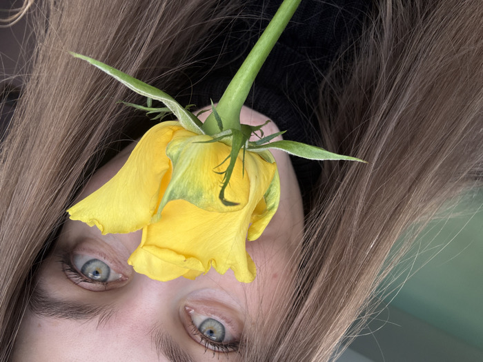A close-up portrait depicts a female subject indoors in Прикамский, Russia. The subject has long, light brown hair and visible blue-grey eyes. A single yellow rose is positioned centrally, partially obscuring the lower half of her face. The rose features bright yellow petals and green sepals. A dark, high-collared garment is visible on the subject's left side. The background is blurred, displaying soft green and darker tones.