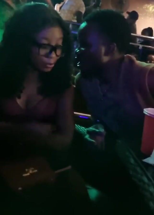 Two women are sitting together in a crowded indoor venue, likely a bar or club, with many people moving in the background