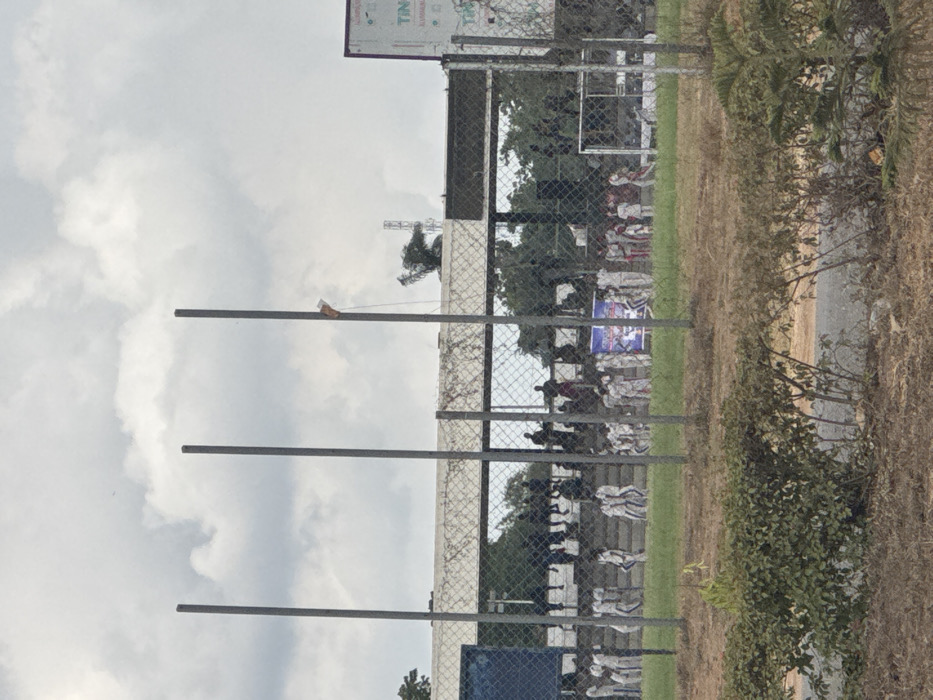 The image displays an outdoor sports complex, likely a stadium or training ground, located in the city of Ife, Nigeria, under an overcast sky. The foreground consists of dry, brown earth and sparse patches of green shrubbery. Three prominent, evenly spaced, vertical gray metal poles rise from behind this vegetation, extending upwards into the frame. A chain-link fence runs horizontally across the mid-ground, acting as a barrier. Behind the fence, a grassy field is populated by numerous individuals, predominantly appearing as children or young adults. Many are dressed in matching white or light-colored uniforms, with some wearing red sashes or accents. They are dispersed across the field, with several groups appearing to be in formations or moving in lines. A blue banner with white text is visible on the field to the left of the center. A white metal goalpost structure is partially visible on the far right of the field. In the background, a concrete grandstand or seating structure is visible, occupied by additional individuals seated or standing. Beyond the grandstand, trees and green foliage are present. To the far right, a large billboard or sign displays the text "TIN" in white letters on a light background. A metal lattice communication tower is discernible in the distant background, rising above the grandstand structure on the right side of the frame.