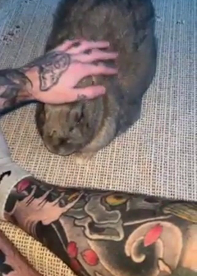 A high-angle, close-up shot shows a person petting a rabbit. The rabbit, with grey fur, is lying on a textured mat. The person's hand, adorned with tattoos, gently strokes the rabbit's head and ears. Visible in the frame is the person's leg, also covered in detailed tattoos, with a sock featuring a Nike logo and graphic design. The environment appears to be indoors, with a neutral color palette, dominated by the mat and the person's clothing.