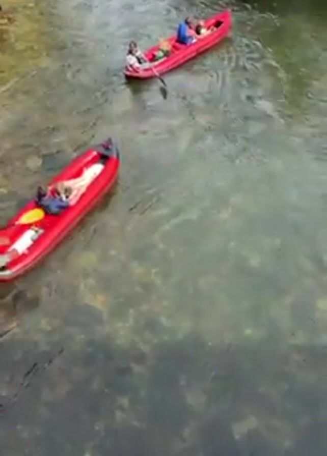Two red inflatable canoes float down a clear river. The first canoe holds a group of adults and children, with one person paddling. In the second canoe, a person sits at the back, paddling, while another person reclines in the front with a dog. The riverbed is visible due to the water’s clarity. The perspective is from an elevated position, possibly a bridge or riverbank.