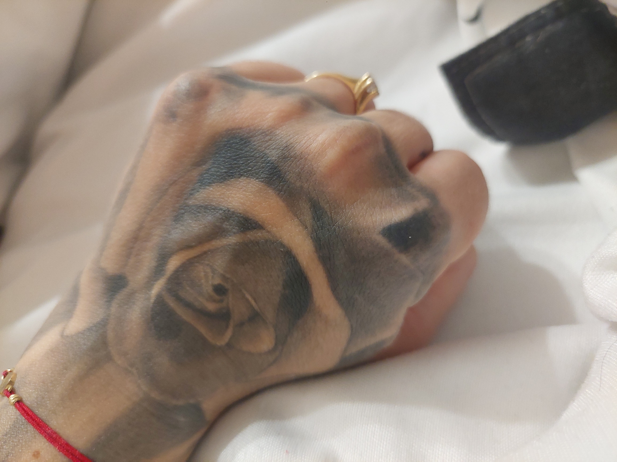 The image displays a human left hand, fair-skinned and slightly clenched, viewed from the dorsal side. The hand is extensively tattooed with a grayscale rose design, featuring prominent petals and a central spiral, covering the back of the hand and extending onto the fingers and wrist. A thin red string bracelet with a small gold-colored charm is visible on the wrist. A gold-colored ring with a single clear stone is worn on the ring finger. The hand rests on a white, soft, and textured fabric surface, possibly a sheet or blanket. A dark, out-of-focus object is partially visible in the lower right quadrant. The specific location within Plovdiv, Bulgaria, is not discernible from the visual evidence presented.