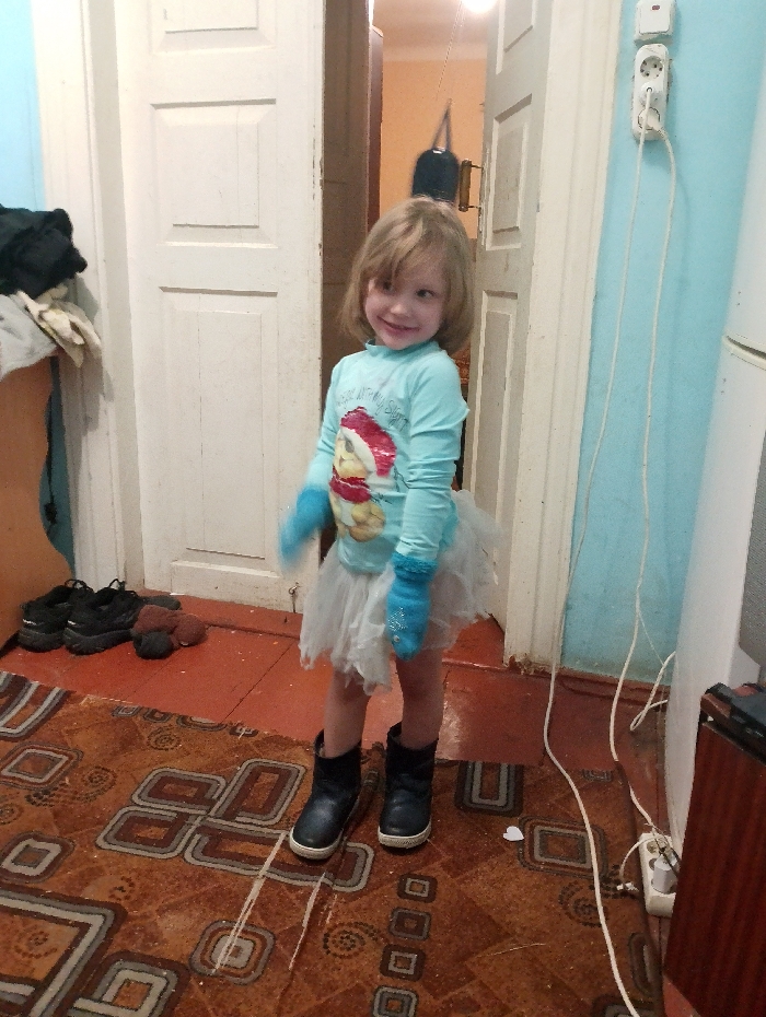 A young girl stands in a doorway. She has blonde hair and wears a light blue long-sleeved shirt with a cartoon character, a white tulle skirt, blue mittens, and black boots. Behind her are open doors and a cluttered room. The walls are light blue and there are electrical outlets with cords hanging down on the right. The floor has a brown patterned rug.