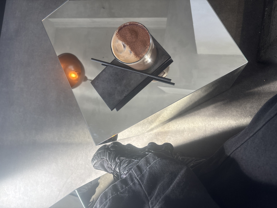 The image presents a high-angle, first-person perspective of an indoor setting, likely a cafe or restaurant in Leeds, United Kingdom. The lower-left quadrant of the frame shows a person's left lower leg, clothed in dark fabric trousers, and a black athletic shoe with a textured sole. The foot rests on a dark, possibly concrete or upholstered, surface. The right side of the image is dominated by a highly reflective, angular surface, likely a mirrored table or counter. Placed on this surface is a clear glass holding a cold beverage, characterized by a light brown liquid with visible ice and a distinct half-circle of dark brown powder (likely cocoa) on its surface. Two black drinking straws are positioned diagonally across the top of the glass and a small, flat, dark rectangular object serving as a coaster or tray. A prominent, warm, amber light source, possibly an overhead lamp, is reflected in the mirrored surface in the upper-right quadrant. Strong, directional lighting creates sharp contrasts, casting bright reflections and deep shadows across the scene. No other individuals or specific city landmarks are visible for further location identification within Leeds.