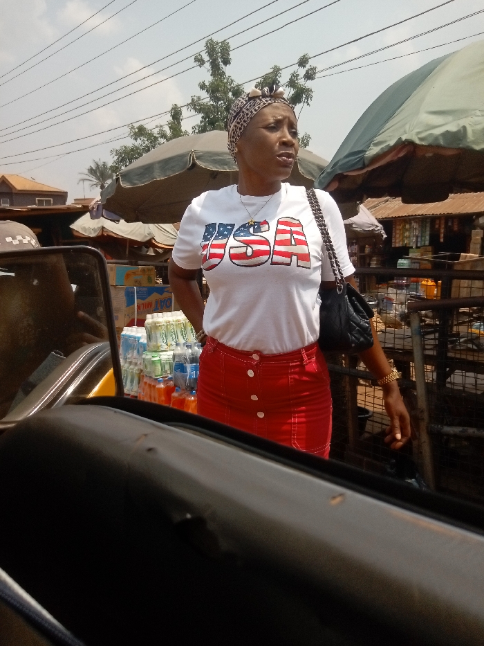 The image displays an adult female standing in an outdoor market environment in Umudioka, Nigeria, captured from the perspective of a seated observer inside a vehicle