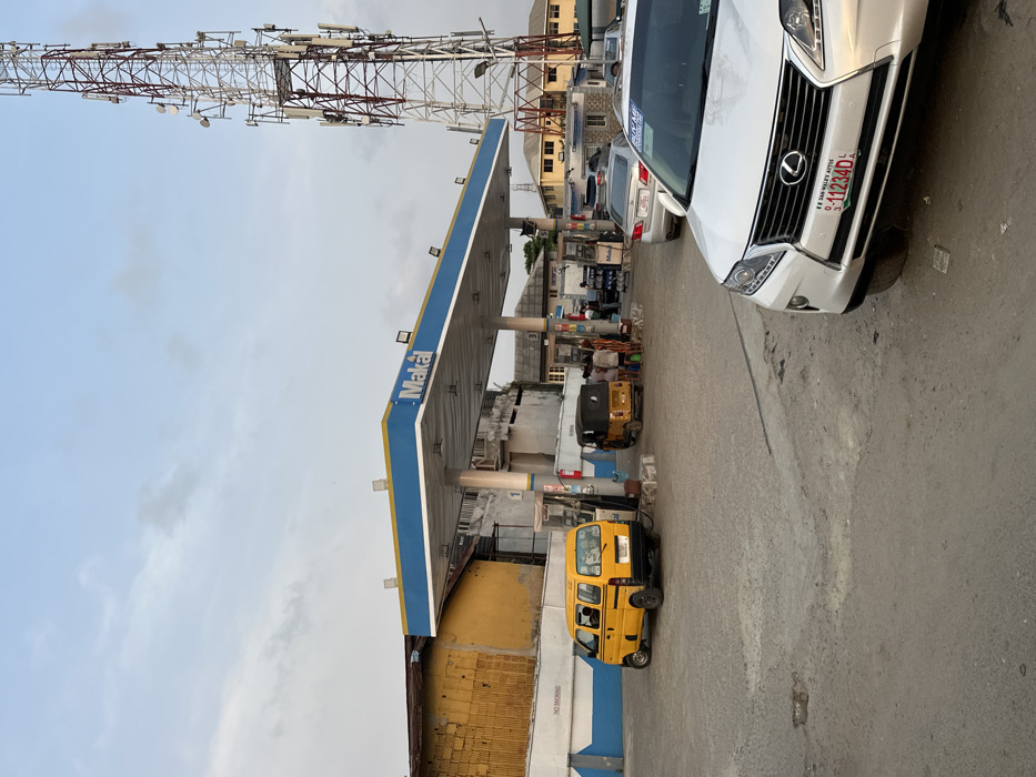 The image displays an urban scene at a "Makal" branded gas station in Lagos, Nigeria, as indicated by the license plate on a prominent vehicle