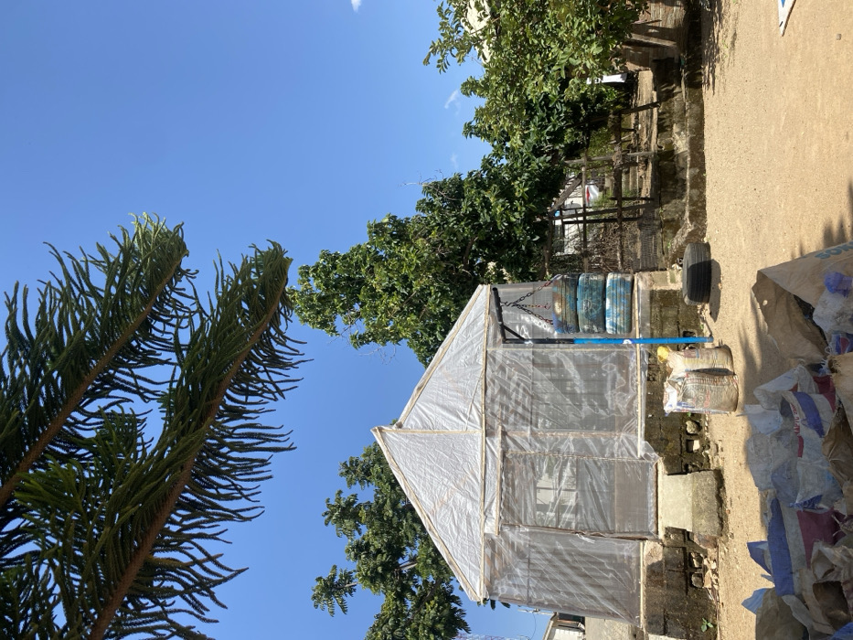 This image depicts a rudimentary greenhouse structure situated on bare earth, likely within a vegetated compound in Jos, Nigeria, under a clear blue sky