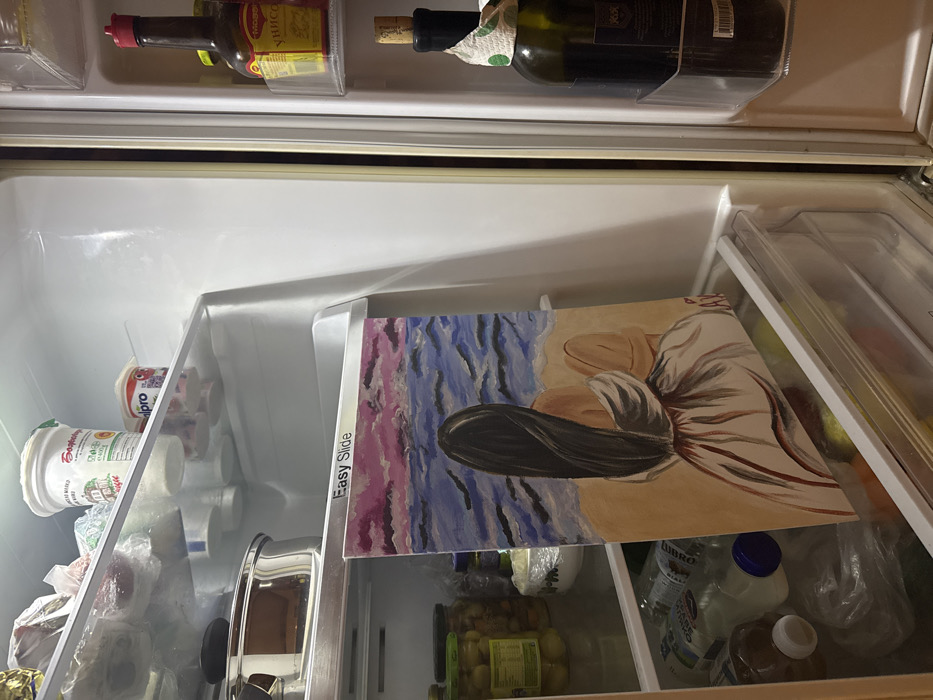 The image displays the illuminated interior of a household refrigerator, viewed from a slightly upward angle, with its door open on the right. The scene is located in Ruse, Bulgaria. Within the main compartment of the refrigerator, various items are present on multiple shelves. The top shelf contains a large white plastic container labeled "Сачилово Българско кисело мляко" (Sachilovo Bulgarian yogurt) and a smaller Alpro container, alongside other items in plastic packaging. The second shelf holds a silver-colored cooking pot with a dark lid. Propped vertically against the back of the third shelf, labeled "Easy Slide," is a rectangular painting. The painting depicts a stylized rendition of a woman observed from behind, possessing long dark hair, seated on a sandy beach. She is attired in a light-colored, possibly white, off-the-shoulder garment. The background features a blue body of water with waves and a sky characterized by pink and purple tones. A signature, resembling "А.К." or "Л.К.", is visible in the lower right corner of the artwork. Below the painting, the fourth shelf contains multiple glass jars filled with green olives or pickles, a white bowl covered with plastic wrap, and several plastic bottles, one containing a white liquid. The bottom drawer is partially visible, holding assorted produce. The interior shelves of the refrigerator door, on the right, display several bottles. The top door shelf holds a red-capped bottle of Maggi Unisauce ("MAGGI УНИСОС") and an adjacent clear bottle. The middle door shelf contains a dark glass bottle, likely wine, sealed with a cork and adorned with a white paper napkin or cloth around its neck. The refrigerator's internal light source brightly illuminates the contents.