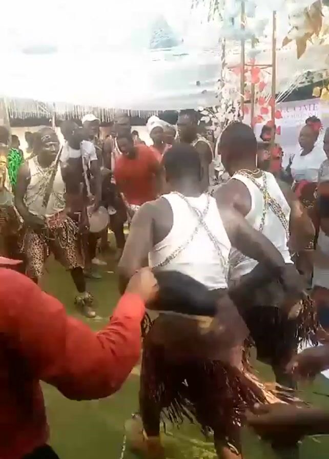 A video shows a group of people dancing outside under a white canopy. A few of the people dancing in the center are wearing white tank tops and short brown skirts with fringe, and decorative beaded necklaces. The camera is at the edge of the group, and it moves around the dancers. Many other people are standing around watching the performance. The surface is covered with green Astroturf. A sign in the background is partially obscured by a white floral display.