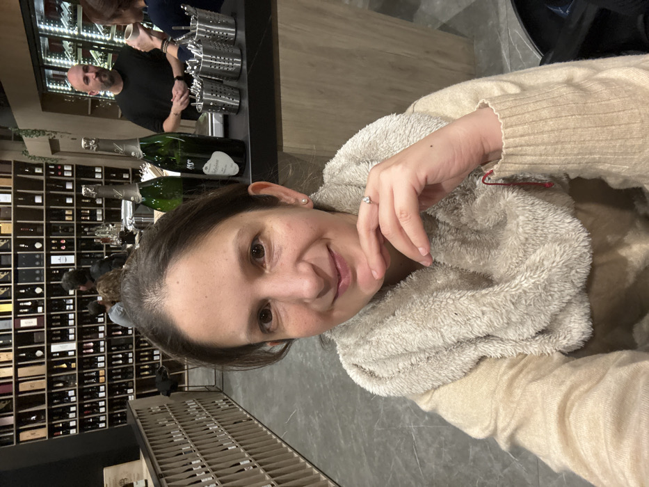 A woman with brown hair and a ring is looking at the camera. She wears a tan sweater and fuzzy scarf. Shelves of wine bottles line the wall behind her. Two green wine bottles sit on a counter. A bald man stands behind the counter holding a white mug, near metal containers. Other people are visible in the background.