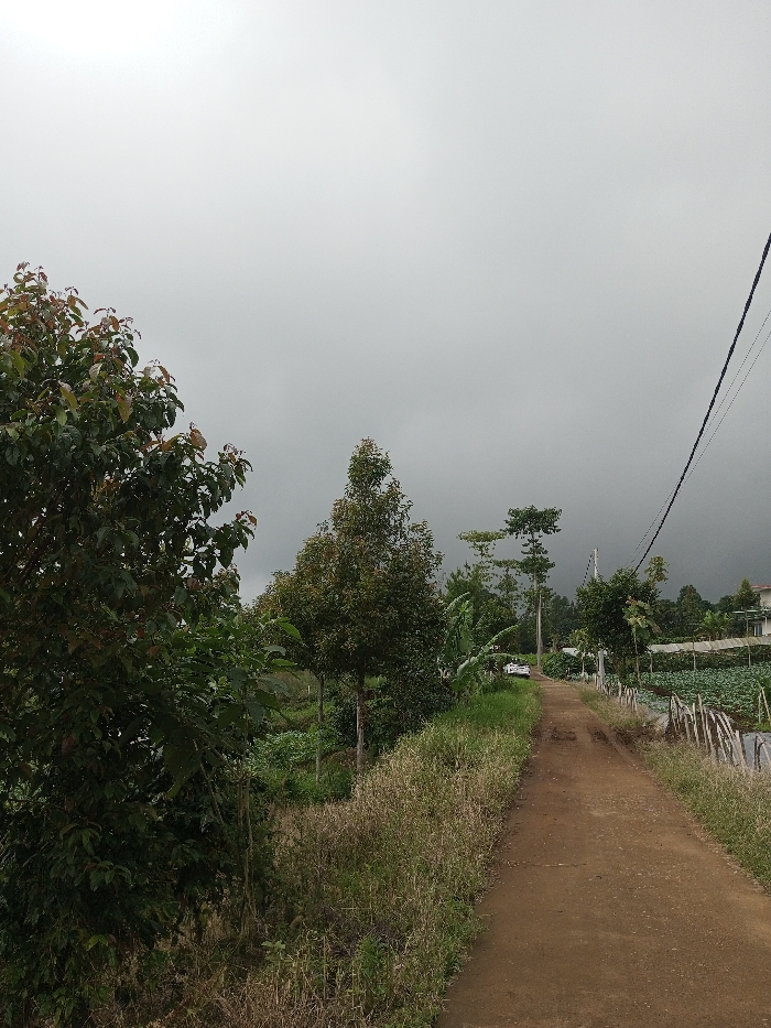The scene depicts a narrow, unpaved reddish-brown dirt road in Kondha, India, extending into the distance under an overcast, light grey sky. To the immediate left, dense foliage of trees and bushes with dark green leaves and some reddish-brown new growth dominates the foreground. Further along the left side of the road, taller evergreen trees are visible, interspersed with other green vegetation. The right side of the road features a strip of wild grass and dried vegetation, beyond which lie cultivated agricultural fields containing rows of green leafy plants, possibly cabbage, supported by rudimentary wooden stakes and string fencing. An electrical utility pole with power lines running diagonally from the upper right is present on the right side. A white passenger vehicle is partially visible further down the road on the right, obscured by trees. In the far right background, a building with a white facade is discernible on elevated ground. No individuals are present in the frame. The overall lighting is diffused, indicating an overcast or foggy environment.