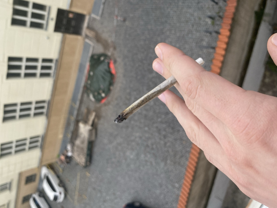- "A light-skinned human hand is positioned in the foreground, holding a lit, partially consumed hand-rolled cigarette or joint" by FM-GMXqP2, licensed under CC BY 4.0
