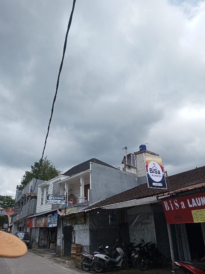 The image displays a street scene in Cibadak, Indonesia, under an overcast, cloudy sky. A dark electrical cable diagonally traverses the upper left portion of the frame. On the right side of a paved road, a row of multi-story buildings lines the street. A prominent two-story building features a grey ground floor and a white upper floor with a small, pillar-supported balcony. A rectangular sign labeled "WEDDING" is affixed below this balcony. To its right, a grey building with a dark roof displays a large vertical banner advertising "BiSa Laundry," with a blue water tank and a television antenna visible on its rooftop. Below this, a lower, single-story building with a dark corrugated roof fronts the street, displaying a partially visible red sign also reading "BiSa Laundry." Multiple motorcycles and scooters, including a white/silver model, are parked on the sidewalk area in front of these lower buildings, alongside several wooden crates. A dark minivan is partially visible on the left edge of the road. A blurry, light-colored object occupies the lower left foreground. No individuals are clearly discernible within the scene.