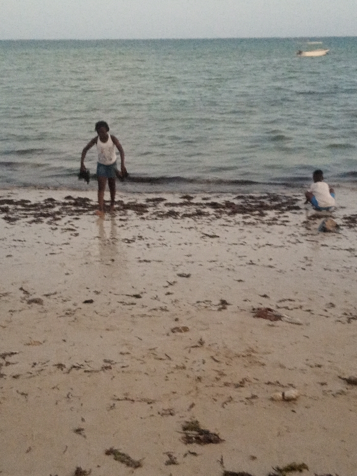 The image depicts a coastal scene in Shanzu ward, Kenya, featuring two individuals on a sandy beach at the edge of a body of water. A first individual, dressed in a white sleeveless top and dark shorts, stands barefoot in shallow water at the immediate shoreline in the left-center foreground. This individual holds dark, sandal-like objects in each hand, with arms bent at the elbows and hands positioned outwards. A second individual, wearing a light-colored top and light-colored shorts, is crouched or kneeling on the wet sand near the waterline in the right-center foreground, facing towards the water. The foreground consists of damp, light-colored sand heavily interspersed with scattered dark brown organic debris, consistent with seaweed or other marine vegetation. The water body beyond the shoreline is calm and exhibits a light blue-green coloration. In the upper right background, a small, light-colored boat is visible on the water surface. The sky appears uniformly light grey, indicating overcast conditions or low light.