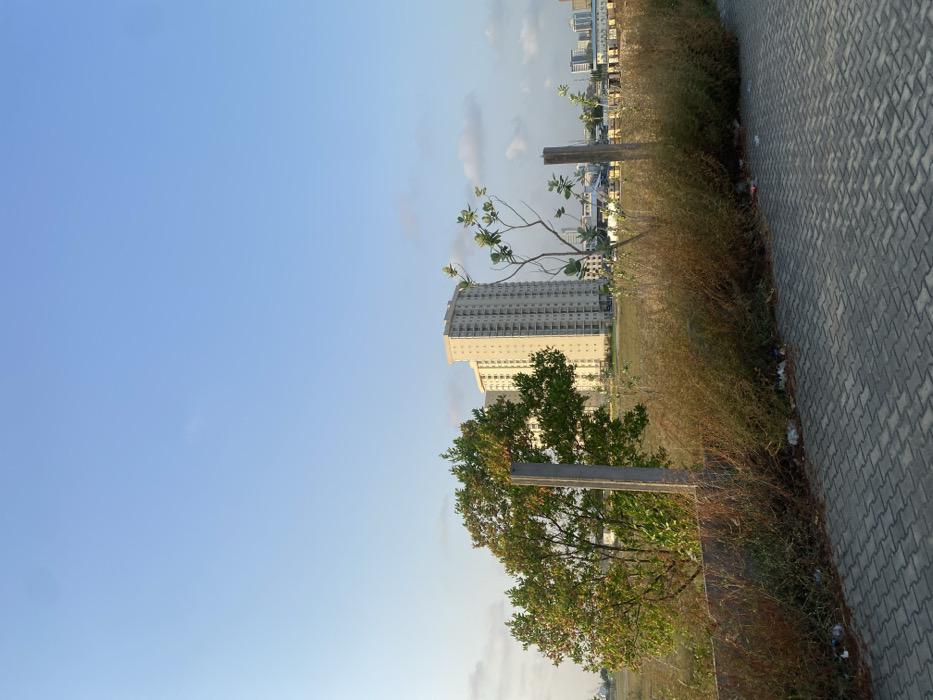 A vertical view features a paved walkway on the right, lined with tall, dry grass. A few scattered trash items are visible. A tall building sits further back, behind some green trees and shrubs. The sky is light blue, with some wispy clouds in the distance. Two light gray fence posts stand in the grass near the walkway.