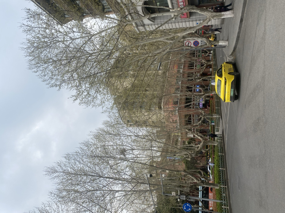 The image depicts an urban street scene in Beibei, China, under an overcast sky. The foreground features an asphalt roadway with a visible white crosswalk on the right side. A bright yellow electric sedan, operating as a taxi with a roof-mounted sign, is positioned in the right lane, oriented towards the right. Its rear license plate includes Chinese characters and "A." A second, partially obscured yellow taxi is visible further down the street on the right. On the far left, a red and white bus is partially visible behind a blue circular mandatory turn sign. The street is bordered by numerous tall, deciduous trees with sparse leaf growth, indicative of early spring. A landscaped central median, featuring low green plantings and metal railings, separates the traffic lanes. Multi-story buildings line both sides of the street. On the left, structures exhibit reddish-brown lower facades with lighter upper sections. On the immediate right, a building features a white facade with classical architectural elements, including arched window frames, and ground-level shopfronts displaying Chinese characters. Several individuals are present: one person stands on the central median, and at least two individuals are visible walking on the right-hand sidewalk. A utility pole on the left supports multiple security cameras. A red circular prohibitory sign is partially visible on the right sidewalk.