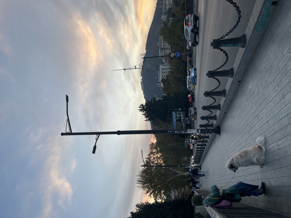 The image depicts an urban scene in Tbilisi, Georgia, at dusk, characterized by a colorful sky displaying hues of blue, pink, and orange clouds. The viewpoint is from a pedestrian walkway on an elevated road or bridge, likely the Baratashvili Bridge area, facing towards Mount Mtatsminda. In the immediate foreground on the left, a person, wearing a green hooded jacket or hat, blue pants, and dark shoes, leans against a dark metal railing. A pink or purple backpack is visible on their back. They hold a dark leash connected to a large, light-colored, fluffy dog with cream or white fur, which is seated on the grey paved walkway. The dog faces right, away from the person, looking towards the street. The pedestrian walkway is constructed of light grey rectangular pavers arranged in a parquet pattern. Further down the walkway, several indistinct figures are visible walking away from the camera. To the right of the walkway, separated by a low concrete barrier, is a multi-lane asphalt road with active traffic. A series of dark, ornate bollards connected by heavy metal chains lines the edge of the road, acting as a divider. Multiple vehicles are present on the road, including a silver SUV on the far right moving away, a blue hatchback in the center, and several other cars and a bus further down. Headlights and taillights are illuminated. A tall, black street light pole with two modern LED fixtures stands prominently in the mid-ground. Another similar pole is visible further down the road. A large digital billboard or sign displaying the text "NEXT" and other Georgian script is visible on the right side of the road. In the background, a large, tree-covered mountain, Mount Mtatsminda, rises. The distinctive Tbilisi TV Tower, a tall, slender structure, is visible atop the mountain. Numerous buildings are scattered across the mountain's slopes and at its base. The sky above is largely clear, showing the transition of daylight.