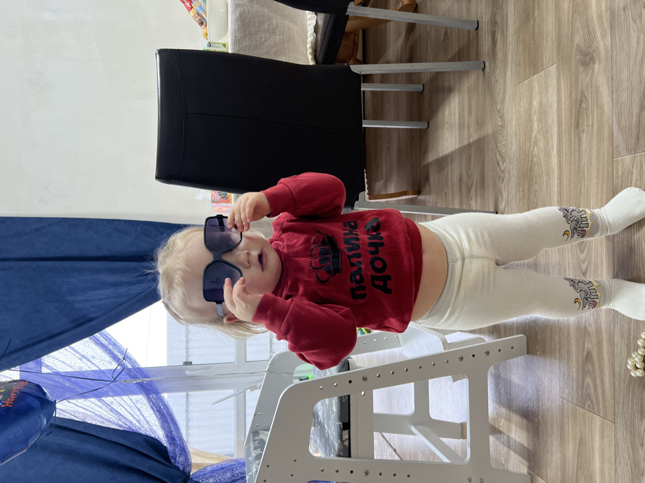 The scene is an indoor domestic setting, specified as Leninakan, Russia. A young child with light-colored hair stands centrally, facing forward, wearing oversized black-framed sunglasses with dark lenses, which they hold by the temples with both hands. The child is dressed in a red long-sleeved top featuring a black crown emblem and Cyrillic text "ПАЛИНА ДОЧКА" (Polina's Daughter). Their midriff is exposed above white leggings adorned with purple and yellow unicorn/pegasus motifs near the ankles, covering white socks. To the left, a white wooden high chair or step stool is partially visible. To the right, two chairs with black backs and silver legs are positioned next to a table covered with a light-colored tablecloth, on which a white bowl and other items are present. The background includes light-colored walls, blue curtains hanging over a window or doorway, and a blue balloon with "Happy Birthday" text visible near the top left. The floor is made of light brown wooden planks. A strand of white spherical beads lies on the floor in the bottom left foreground.