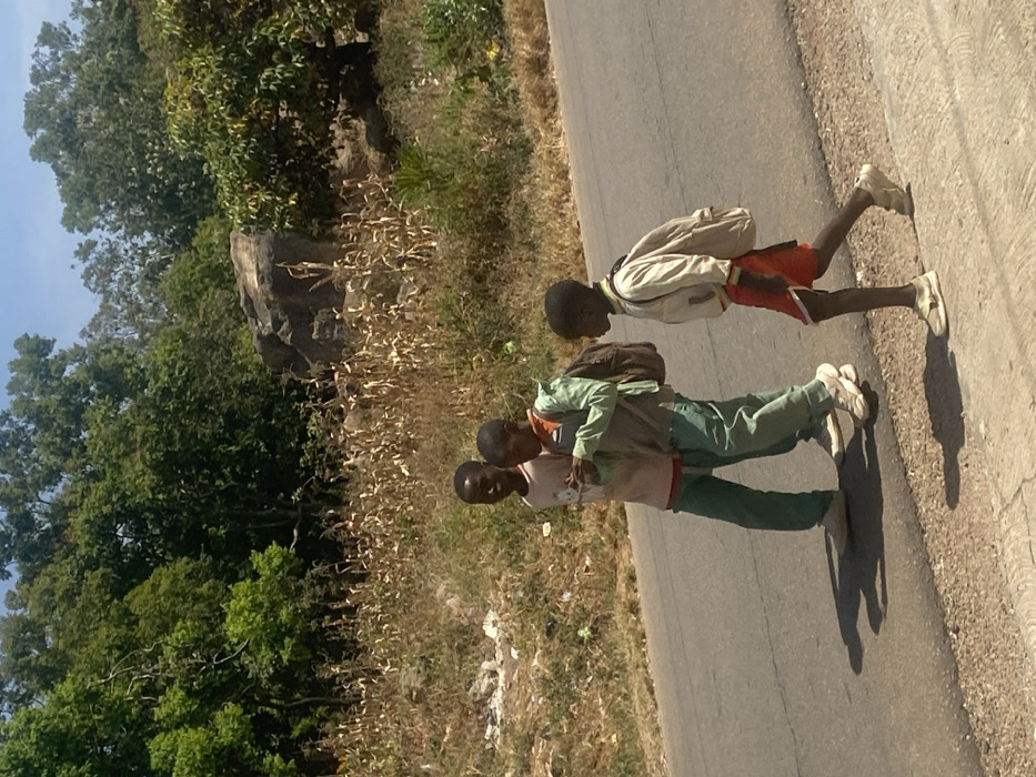 The image depicts three young males walking along the side of a paved road in Gura Top, Nigeria, under bright daylight