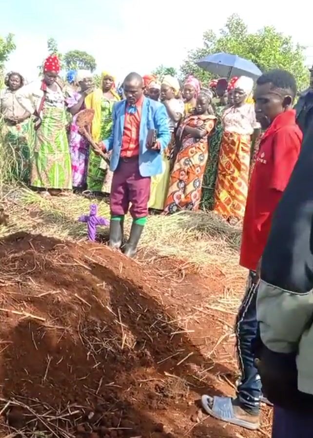 group of people gathered outdoors, presumably at a burial site. A freshly dug grave covered with a mound of dirt is visible in the foreground. The group appears to be observing a man in the center who is holding a shovel. Another man in a red shirt is seen digging with a shovel into the dirt mound. Several women stand behind the mound, dressed in vibrant, patterned clothing, some with head coverings. The environment appears to be rural, with tall grass and trees in the background, with clear blue skies. The group's interaction suggests a solemn occasion, likely a funeral or burial ceremony.