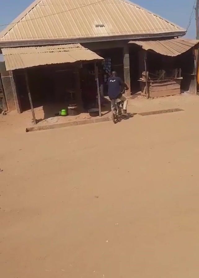 The video depicts a dusty village scene with several people walking and riding bicycles