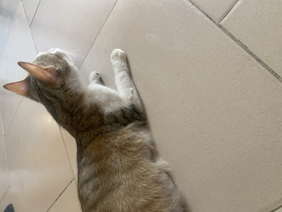 - "A domestic cat is depicted lying on a light-colored tiled floor within the city of Katcha, Nigeria" by FM-8Yh6N2, licensed under CC BY 4.0