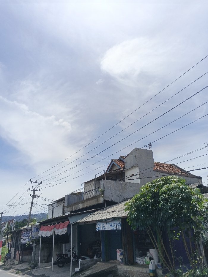 A multi-story building dominates the scene, with a mix of concrete and red tile roofing. Below, several shops or storefronts are visible, partially obscured by a lush green bush. Wires crisscross the sky above, adding a network of lines to the composition. A utility pole stands to the left, supporting the power lines. The sky is partly cloudy.