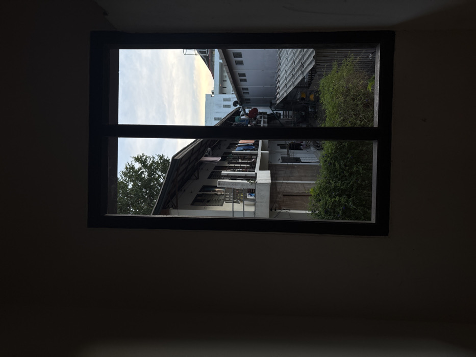 This image, captured from inside a dimly lit room in Ko Tao, Thailand, looks out through a dark-framed window onto a dense urban environment