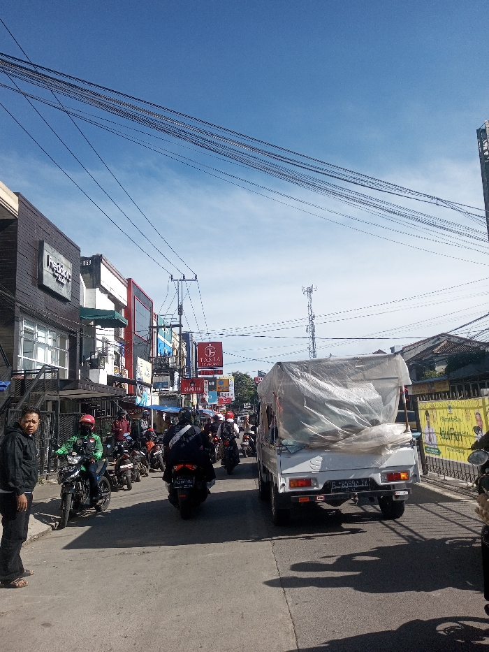 The image depicts a busy urban street scene under a clear blue sky with scattered wispy clouds, indicating daytime. While the prompt specifies Phonethan, Laos, visual evidence, specifically a vehicle license plate "B 8599 YK" (indicative of Indonesia, specifically Jakarta) and Indonesian names on commercial signage (e.g., "TANIA JAYANTI"), contradicts this, suggesting the location is in Indonesia. The foreground features a paved asphalt road with visible shadows from vehicles and overhead structures. On the left side of the road, a male individual in a dark hoodie, dark pants, and light-colored sandals stands facing slightly toward the camera. Adjacent to him and extending into the street, a line of motorcycles and their riders are present, including one individual in a green jacket and helmet on a black motorcycle immediately behind the standing man. Multiple other motorcycles with riders are observed further down the road, indicating traffic flow. A white pickup truck, with its bed covered by a clear or translucent plastic tarp, is positioned in the right lane, facing away from the camera. Its rear license plate "B 8599 YK" is clearly legible. A portion of another motorcycle is visible on the far right. To the left of the road, commercial buildings line the street. The nearest building has dark paneling and large windows on its upper floor, with a sign displaying text similar to "Theodors". Below this, an outdoor area with metal railings is visible. Further down, multiple storefronts are present, adorned with various colorful signs, including a prominent red sign with white lettering identifying "TANIA JAYANTI" (or similar) with a 'TJ' logo. A dense network of black utility wires and cables crisscrosses overhead, supported by utility poles. In the background, to the right of the traffic, a more residential area with houses and some greenery is visible. A yellow banner with images and text, possibly an advertisement or political poster, is partially obscured by a fence. A tall, latticed telecommunications tower stands against the sky in the middle distance.