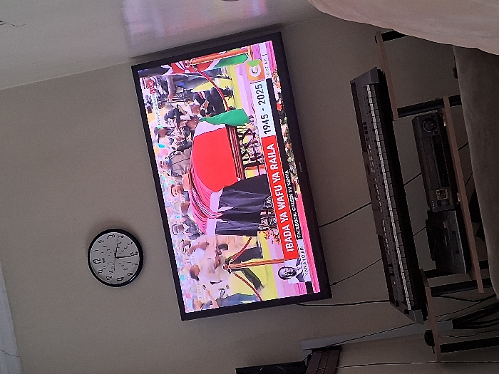 In an indoor setting within a residence in Ongata Rongai, Kenya, a light-colored wall features a round analog clock, showing approximately 12:40. Below the clock, a flat-screen television is displaying a news broadcast. The TV content depicts a funeral ceremony, centered on a casket draped in red and black fabric, attended by multiple individuals. Two Kenyan flags are visible on the right side of the screen's scene. Text overlays on the television read "IBADA YA WAFU YA RAILA" (Funeral service of Raila) and "1945 - 2025," alongside a small portrait of a man, likely Raila Odinga. Other text includes "FACEBOOK: CITIZEN TV KENYA" and a timestamp of "10:07 AM." Beneath the television, a black electronic music keyboard rests on the top shelf of a dark-framed entertainment stand. On a lower shelf of the stand, a dark-colored electronic media player is situated. Multiple dark cables are visible behind the stand. A gray upholstered furniture piece and a light-colored garment are partially visible on the right side of the frame.