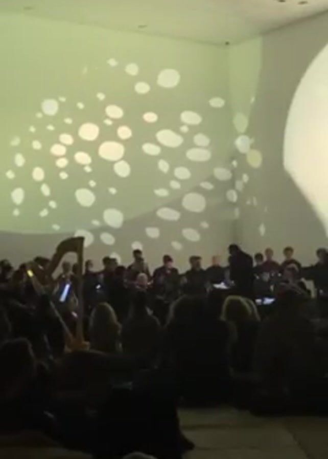 dimly lit indoor space, likely a hall or auditorium, where an orchestra is performing. The musicians, dressed in dark clothing, are seated in front of the audience. A conductor, silhouetted, stands facing them, directing the performance. A harp is visible on the left side of the frame. The audience is seated on the floor, many appearing to be leaning against pillows for comfort. The walls are painted white, with a pattern of large, round shapes projected onto them, casting a soft, ambient light. The overall atmosphere is one of relaxed appreciation of the musical performance.