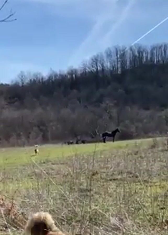 dog running in a field towards the camera. In the background, two horses stand on a grassy plain with a tractor and other indistinct shapes further back. A forest covers a hillside in the distance under a blue sky with a contrail. The foreground includes dry grass and a partially visible tree branch.