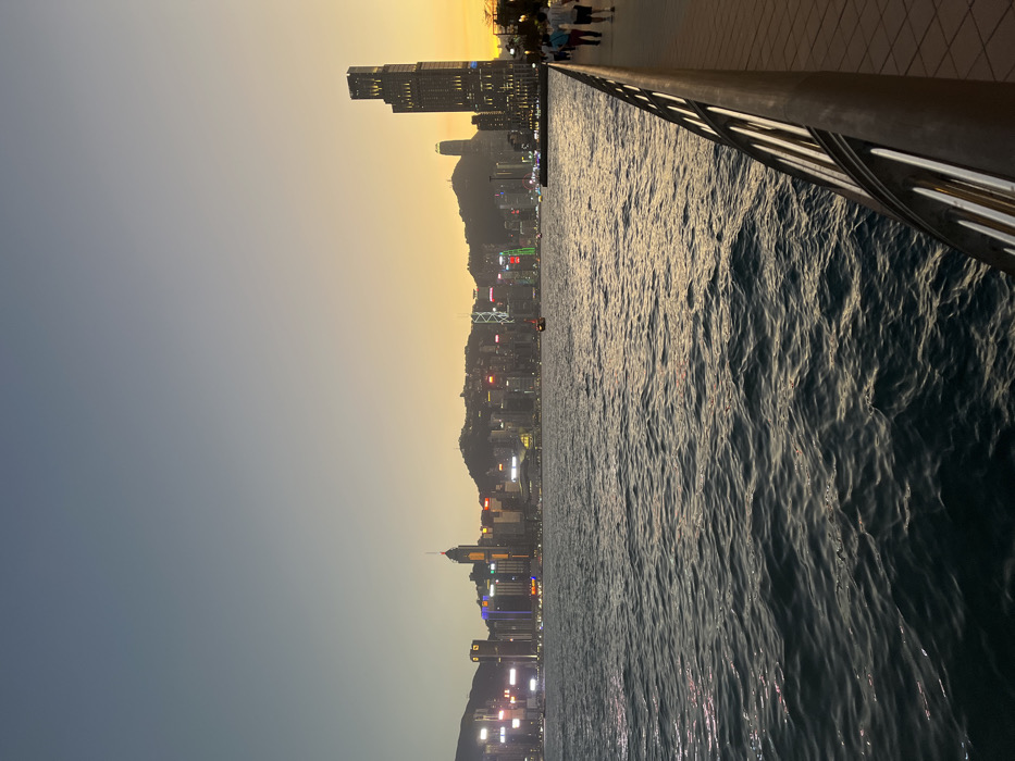 The image presents a panoramic view across Victoria Harbour from a promenade in Kowloon, China, at dusk