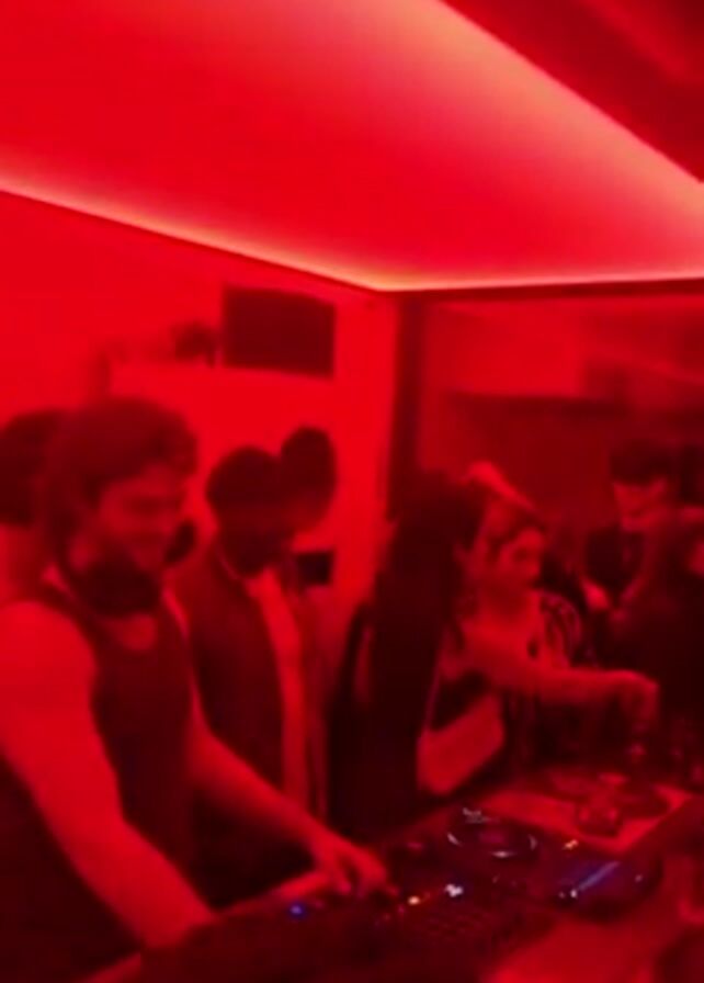 crowded, red-lit space with people dancing to music played by a DJ. The DJ, wearing a tank top and headphones, is operating a DJ mixing console. Several people are standing or dancing around him, some holding drinks. The room has a mirrored wall and some decorative elements, but the overall lighting obscures many details.