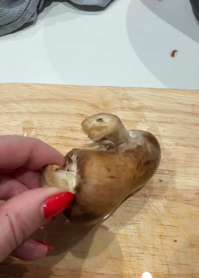 A person with red nail polish rotates a large, brown, damp mushroom in their hand