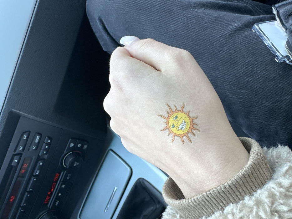 The image depicts a close-up of a person's left hand, featuring a temporary smiling sun tattoo on its dorsal surface