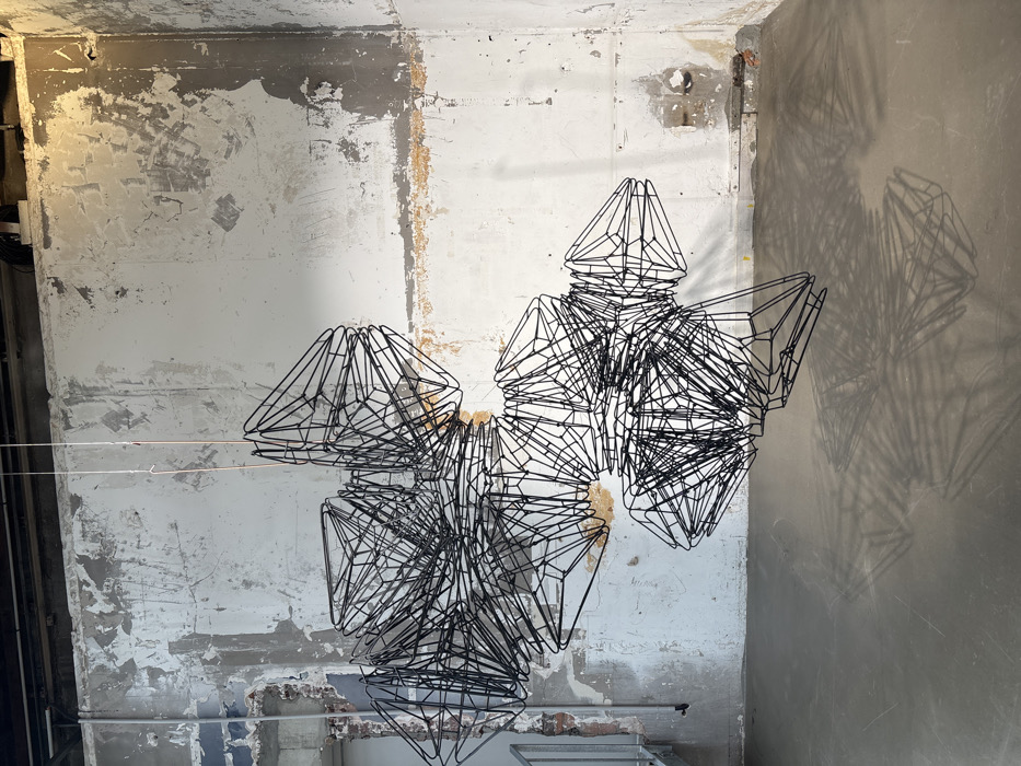 The image displays an indoor art installation within a repurposed industrial or gallery space in Paris, France. A large, complex sculpture, constructed from numerous interconnected black geometric open frames (resembling triangular prisms or multifaceted polygons), is suspended centrally from the ceiling by thin cords. This abstract, cloud-like mass casts intricate, dark shadows onto the floor below. The environment features distressed, rough-textured walls painted a faded off-white, with significant areas of paint peeling, revealing underlying grey concrete, patches of yellowish plaster, and hints of red brick. These walls show signs of age and wear. The floor is a flat, unadorned light grey concrete. On the far left, a portion of a metal staircase with railings is visible. The ceiling, partially obscured, appears to be dark with exposed structural elements. No individuals are present in the scene.