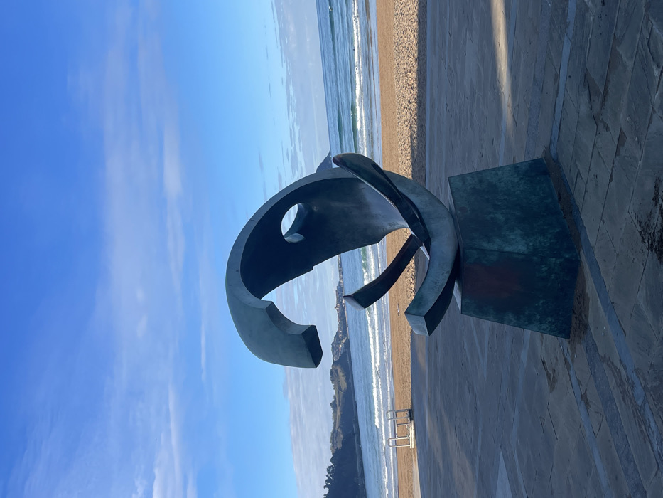 The image displays a large, dark, abstract metal sculpture centrally located on a paved promenade in Zarautz, Spain