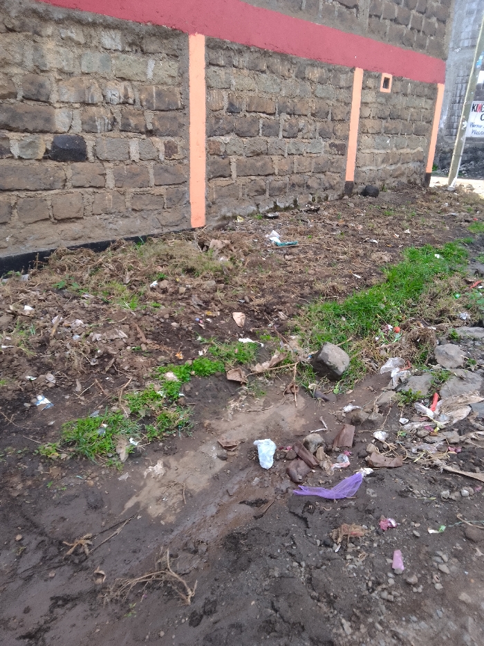 The scene depicts an outdoor environment in Njoro ward, Kenya. The foreground and midground consist of disturbed dark earth mixed with dry vegetation, sparse green grass, small stones, and various forms of litter. Observable debris includes crumpled plastic bags (one light blue/white, one purple net-like), white plastic fragments, paper scraps, and unidentifiable refuse. A stone or brick wall, composed of dark, irregularly shaped blocks, forms the background. The wall features a horizontal red painted stripe across its upper section and two complete, vertically oriented orange painted stripes, along with a partial third stripe on the right. A small, square, orange-painted recess is present on the upper right portion of the wall. Beyond the wall's right edge, a utility pole and a partially visible sign with text including "KIN" and "Welcome" are discernible. No individuals, explicit actions, or interactions are visible.