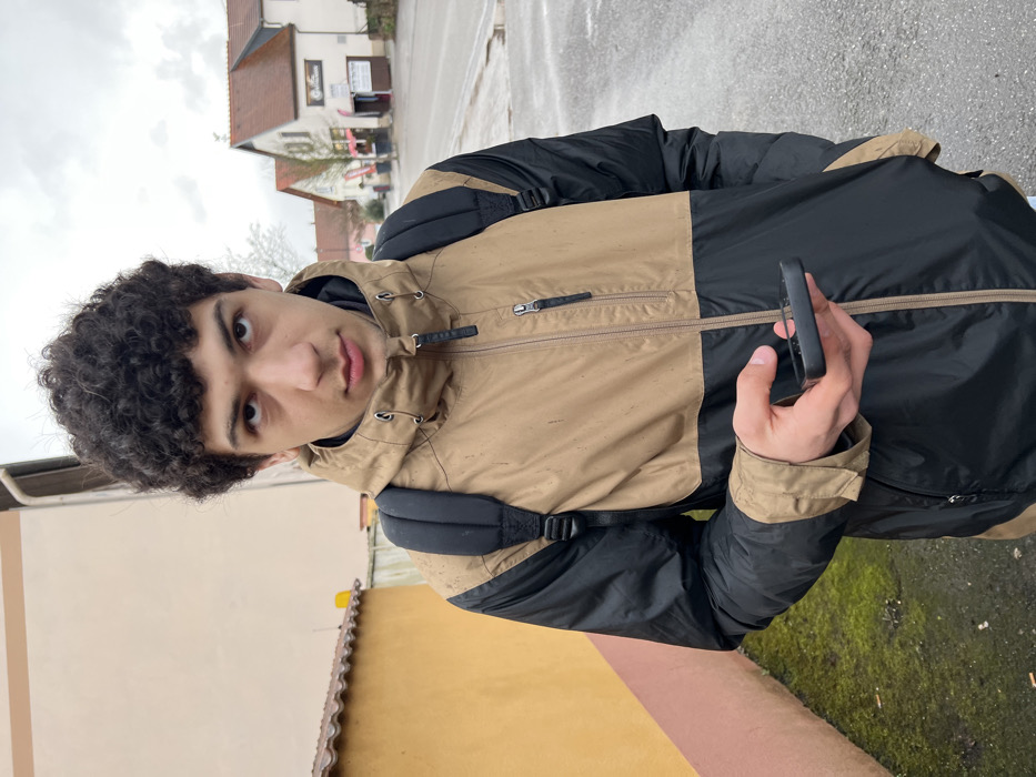 A young male individual, appearing to be in his late teens or early twenties, with dark, curly hair and light-to-medium complexion, is depicted in a medium-shot portrait taken outdoors in Meistratzheim, France, under an overcast sky. He is wearing a two-tone jacket, light tan/brown on the upper portion and black on the lower half, which exhibits dark specks or stains on the tan fabric. A black backpack is worn over his shoulders. His right hand holds a black smartphone horizontally, with the screen oriented away from the camera. He gazes directly forward with a neutral to slightly serious expression. The immediate foreground to the left features a section of a building with an orange-tan painted wall and a terracotta-tiled roofline. Green moss is visible on the ground level adjacent to this structure. To the right and extending into the background, a paved road surface is present. Beyond the road, architectural elements characteristic of the Alsace region are visible. The most prominent building on the right has a brown tiled roof, light-colored walls, and appears to be a commercial establishment, possibly an inn or restaurant, with a sign partially displaying "Gaststätte." Another building with a red tiled roof is visible further in the background. Sparse, bare trees are discernible in the distance, and the sky is uniformly grey.